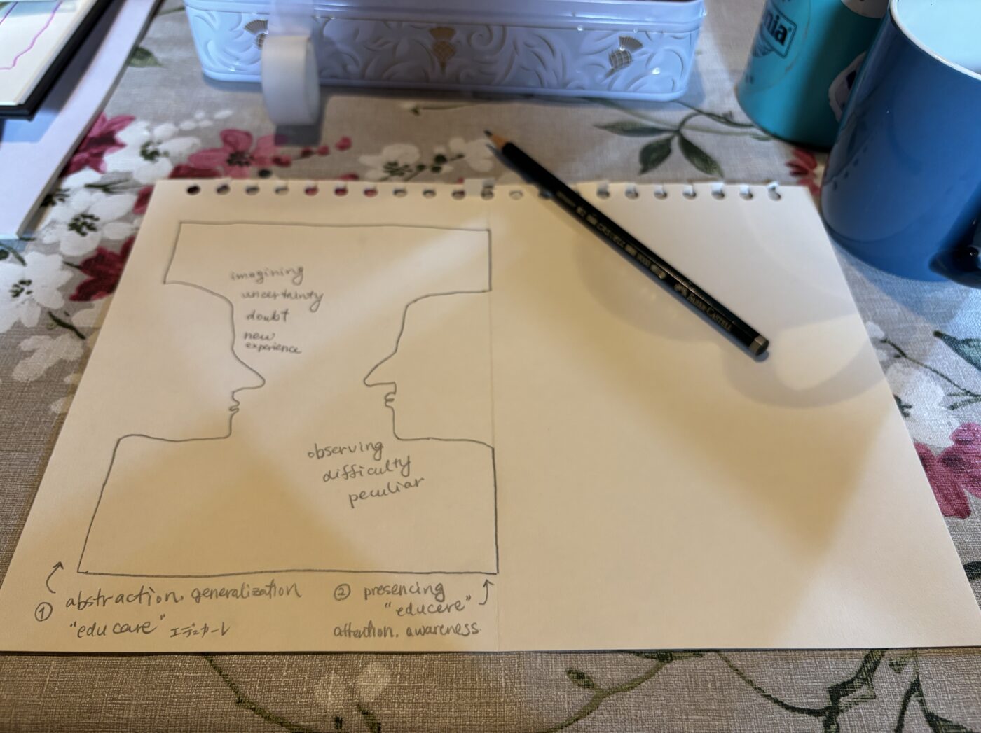 セッションでは、人の横顔を描いたり(右下写真)、騙し絵を数枚見たりしたのだけど、エマが話していて理解できたことを少しシェアすると: